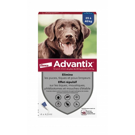 ","description_short":"","available_now":"Livraison entre 48h et 72h (hors Corse) ouvru00e9s chez votre vu00e9tu00e9rinaire","available_later":"En cours de ru00e9approvisionnement","id":73944,"id_product":73944,"out_of_stock":2,"new":0,"id_product_attribute":136462,"quantity_wanted":1,"extraContent":[{"title":"Product tab title","content":"","attr":{"id":"","class":""},"moduleName":"totcustomfields"}],"allow_oosp":0,"category":"externe","category_name":"Externe","link":"https://www.vetoavenue.fr/73944-advantix-grand-chien-de-25-a-40-kg.html","attribute_price":1.54,"price_tax_exc":26.43,"price_without_reduction":31.716,"reduction":0,"specific_prices":[],"quantity":99,"quantity_all_versions":99,"id_image":"fr-default","features":[{"name":"Groupe Espu00e8ces","value":"Chiens","id_feature":"1","position":"0"},{"name":"Espu00e8ces","value":"Chiens","id_feature":"2","position":"1"},{"name":"Type de produits","value":"Produits vu00e9tu00e9rinaires","id_feature":"3","position":"2"},{"name":"Type de produits","value":"Antiparasitaires","id_feature":"3","position":"2"},{"name":"Objectifs Santu00e9","value":"Externe","id_feature":"6","position":"5"},{"name":"Age","value":"Adulte","id_feature":"63","position":"8"},{"name":"Taille de l’animal","value":"Grande race","id_feature":"64","position":"9"}],"attachments":[{"id_product":"73944","id_attachment":"1327","file":"16afdb26c945b9fe3175948e6f62dcf5744f74a4","file_name":"Fiche Conseil – AntiParasitaires Chien.pdf","file_size":"2907324","mime":"application/pdf","id_lang":"1","name":"anti parasitaires chien","description":""},{"id_product":"73944","id_attachment":"1951","file":"4f87a1ae6cb1ff6077a58cd6aef808072b592a5b","file_name":"ML_Advantix_2021.pdf","file_size":"118367","mime":"application/pdf","id_lang":"1","name":"Mentions lu00e9gales Advantix","description":""}],"virtual":0,"pack":0,"packItems":[],"nopackprice":0,"customization_required":false,"attributes":{"5":{"id_attribute":"10669","id_attribute_group":"5","name":"Bou00eete de 1 sachet de 4 pipettes de 4ml","group":"Pru00e9sentation","reference":"4007221016700","ean13":"4007221016700","isbn":"","upc":"400722101670","mpn":""}},"rate":20,"tax_name":"TVA FR 20%","ecotax_rate":0,"unit_price":"","customizations":{"fields":[]},"id_customization":0,"is_customizable":false,"show_quantities":true,"quantity_label":"Produits","quantity_discounts":[],"customer_group_discount":0,"images":[{"bySize":{"cart_default":{"url":"https://www.vetoavenue.fr/158392-cart_default/advantix-grand-chien-de-25-a-40-kg.jpg","width":90,"height":90},"small_default":{"url":"https://www.vetoavenue.fr/158392-small_default/advantix-grand-chien-de-25-a-40-kg.jpg","width":90,"height":90},"home_default":{"url":"https://www.vetoavenue.fr/158392-home_default/advantix-grand-chien-de-25-a-40-kg.jpg","width":278,"height":278},"medium_default":{"url":"https://www.vetoavenue.fr/158392-medium_default/advantix-grand-chien-de-25-a-40-kg.jpg","width":455,"height":455},"large_default":{"url":"https://www.vetoavenue.fr/158392-large_default/advantix-grand-chien-de-25-a-40-kg.jpg","width":800,"height":800}},"small":{"url":"https://www.vetoavenue.fr/158392-cart_default/advantix-grand-chien-de-25-a-40-kg.jpg","width":90,"height":90},"medium":{"url":"https://www.vetoavenue.fr/158392-home_default/advantix-grand-chien-de-25-a-40-kg.jpg","width":278,"height":278},"large":{"url":"https://www.vetoavenue.fr/158392-large_default/advantix-grand-chien-de-25-a-40-kg.jpg","width":800,"height":800},"legend":"","id_image":"158392","cover":"1","position":"1","associatedVariants":[]}],"cover":{"bySize":{"cart_default":{"url":"https://www.vetoavenue.fr/158392-cart_default/advantix-grand-chien-de-25-a-40-kg.jpg","width":90,"height":90},"small_default":{"url":"https://www.vetoavenue.fr/158392-small_default/advantix-grand-chien-de-25-a-40-kg.jpg","width":90,"height":90},"home_default":{"url":"https://www.vetoavenue.fr/158392-home_default/advantix-grand-chien-de-25-a-40-kg.jpg","width":278,"height":278},"medium_default":{"url":"https://www.vetoavenue.fr/158392-medium_default/advantix-grand-chien-de-25-a-40-kg.jpg","width":455,"height":455},"large_default":{"url":"https://www.vetoavenue.fr/158392-large_default/advantix-grand-chien-de-25-a-40-kg.jpg","width":800,"height":800}},"small":{"url":"https://www.vetoavenue.fr/158392-cart_default/advantix-grand-chien-de-25-a-40-kg.jpg","width":90,"height":90},"medium":{"url":"https://www.vetoavenue.fr/158392-home_default/advantix-grand-chien-de-25-a-40-kg.jpg","width":278,"height":278},"large":{"url":"https://www.vetoavenue.fr/158392-large_default/advantix-grand-chien-de-25-a-40-kg.jpg","width":800,"height":800},"legend":"","id_image":"158392","cover":"1","position":"1","associatedVariants":[]},"has_discount":false,"discount_type":null,"discount_percentage":null,"discount_percentage_absolute":null,"discount_amount":null,"discount_amount_to_display":null,"price_amount":31.72,"unit_price_full":"","show_availability":true,"availability_date":null,"availability_message":"Livraison entre 48h et 72h (hors Corse) ouvru00e9s chez votre vu00e9tu00e9rinaire","availability":"available"} »>