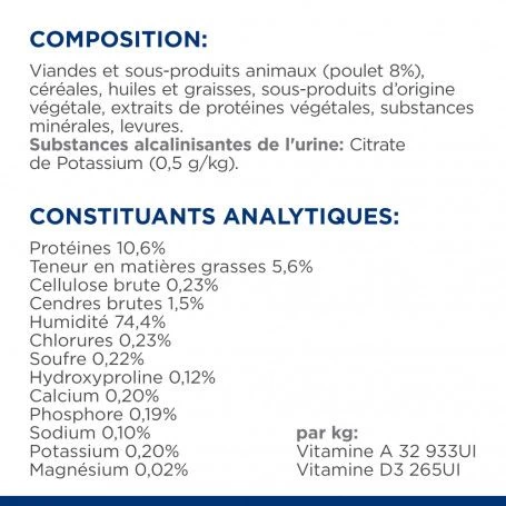 Retrouvez toute l’alimentation humide mu00e9dicalisu00e9e Hill’s pour les troubles urinaires du chat.