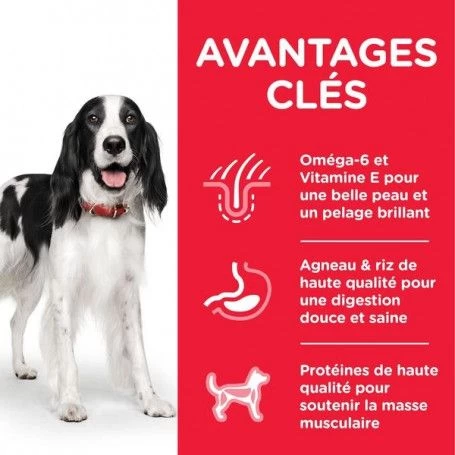 Les croquettes Hill’s Canine Adult Medium Agneau & Riz constituent une alimentation complu00e8te pour les chiens adultes de taille moyenne (de 11 u00e0 25 kg).u00a0