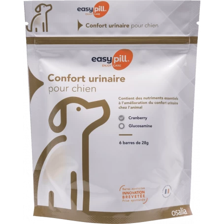n ","attr":{"id":"","class":""},"moduleName":"totcustomfields"}],"allow_oosp":0,"category":"systeme-urinaire","category_name":"Systu00e8me urinaire","link":"https://www.vetoavenue.fr/78617-easypill-chien-confort-urinaire.html","attribute_price":24.79,"price_tax_exc":24.79,"price_without_reduction":29.748,"reduction":0,"specific_prices":[],"quantity":99,"quantity_all_versions":99,"id_image":"fr-default","features":[{"name":"Groupe Espu00e8ces","value":"Chiens","id_feature":"1","position":"0"},{"name":"Espu00e8ces","value":"Chiens","id_feature":"2","position":"1"},{"name":"Type de produits","value":"Produits vu00e9tu00e9rinaires","id_feature":"3","position":"2"},{"name":"Type de produits","value":"Complu00e9ments nutritionnels","id_feature":"3","position":"2"},{"name":"Objectifs Santu00e9","value":"Pru00e9vention ru00e9nale","id_feature":"6","position":"5"},{"name":"Objectifs Santu00e9","value":"Pru00e9vention urinaire","id_feature":"6","position":"5"}],"attachments":[],"virtual":0,"pack":0,"packItems":[],"nopackprice":0,"customization_required":false,"attributes":{"5":{"id_attribute":"11584","id_attribute_group":"5","name":"Bou00eete de 6 barres de 28 g","group":"Pru00e9sentation","reference":"3760302730018","ean13":"3760302730018","isbn":"","upc":"376030273001","mpn":""}},"rate":20,"tax_name":"TVA FR 20%","ecotax_rate":0,"unit_price":"","customizations":{"fields":[]},"id_customization":0,"is_customizable":false,"show_quantities":true,"quantity_label":"Produits","quantity_discounts":[],"customer_group_discount":0,"images":[{"bySize":{"cart_default":{"url":"https://www.vetoavenue.fr/158575-cart_default/easypill-chien-confort-urinaire.jpg","width":90,"height":90},"small_default":{"url":"https://www.vetoavenue.fr/158575-small_default/easypill-chien-confort-urinaire.jpg","width":90,"height":90},"home_default":{"url":"https://www.vetoavenue.fr/158575-home_default/easypill-chien-confort-urinaire.jpg","width":278,"height":278},"medium_default":{"url":"https://www.vetoavenue.fr/158575-medium_default/easypill-chien-confort-urinaire.jpg","width":455,"height":455},"large_default":{"url":"https://www.vetoavenue.fr/158575-large_default/easypill-chien-confort-urinaire.jpg","width":800,"height":800}},"small":{"url":"https://www.vetoavenue.fr/158575-cart_default/easypill-chien-confort-urinaire.jpg","width":90,"height":90},"medium":{"url":"https://www.vetoavenue.fr/158575-home_default/easypill-chien-confort-urinaire.jpg","width":278,"height":278},"large":{"url":"https://www.vetoavenue.fr/158575-large_default/easypill-chien-confort-urinaire.jpg","width":800,"height":800},"legend":"","id_image":"158575","cover":"1","position":"1","associatedVariants":["144428"]}],"cover":{"bySize":{"cart_default":{"url":"https://www.vetoavenue.fr/158575-cart_default/easypill-chien-confort-urinaire.jpg","width":90,"height":90},"small_default":{"url":"https://www.vetoavenue.fr/158575-small_default/easypill-chien-confort-urinaire.jpg","width":90,"height":90},"home_default":{"url":"https://www.vetoavenue.fr/158575-home_default/easypill-chien-confort-urinaire.jpg","width":278,"height":278},"medium_default":{"url":"https://www.vetoavenue.fr/158575-medium_default/easypill-chien-confort-urinaire.jpg","width":455,"height":455},"large_default":{"url":"https://www.vetoavenue.fr/158575-large_default/easypill-chien-confort-urinaire.jpg","width":800,"height":800}},"small":{"url":"https://www.vetoavenue.fr/158575-cart_default/easypill-chien-confort-urinaire.jpg","width":90,"height":90},"medium":{"url":"https://www.vetoavenue.fr/158575-home_default/easypill-chien-confort-urinaire.jpg","width":278,"height":278},"large":{"url":"https://www.vetoavenue.fr/158575-large_default/easypill-chien-confort-urinaire.jpg","width":800,"height":800},"legend":"","id_image":"158575","cover":"1","position":"1","associatedVariants":["144428"]},"has_discount":false,"discount_type":null,"discount_percentage":null,"discount_percentage_absolute":null,"discount_amount":null,"discount_amount_to_display":null,"price_amount":29.75,"unit_price_full":"","show_availability":true,"availability_date":null,"availability_message":"Livraison entre 48h et 72h (hors Corse) ouvru00e9s chez votre vu00e9tu00e9rinaire","availability":"available"} »>