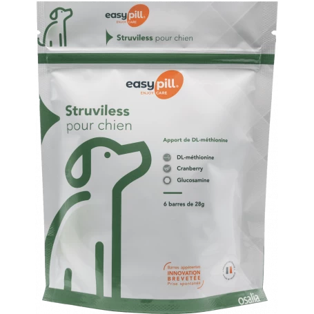 n ","attr":{"id":"","class":""},"moduleName":"totcustomfields"}],"allow_oosp":0,"category":"systeme-urinaire","category_name":"Systu00e8me urinaire","link":"https://www.vetoavenue.fr/78619-easypill-chien-struvite.html","attribute_price":25.88,"price_tax_exc":25.88,"price_without_reduction":31.056,"reduction":0,"specific_prices":[],"quantity":99,"quantity_all_versions":99,"id_image":"fr-default","features":[{"name":"Groupe Espu00e8ces","value":"Chiens","id_feature":"1","position":"0"},{"name":"Espu00e8ces","value":"Chiens","id_feature":"2","position":"1"},{"name":"Type de produits","value":"Produits vu00e9tu00e9rinaires","id_feature":"3","position":"2"},{"name":"Type de produits","value":"Complu00e9ments nutritionnels","id_feature":"3","position":"2"},{"name":"Objectifs Santu00e9","value":"Pru00e9vention ru00e9nale","id_feature":"6","position":"5"},{"name":"Objectifs Santu00e9","value":"Pru00e9vention urinaire","id_feature":"6","position":"5"}],"attachments":[],"virtual":0,"pack":0,"packItems":[],"nopackprice":0,"customization_required":false,"attributes":{"5":{"id_attribute":"11584","id_attribute_group":"5","name":"Bou00eete de 6 barres de 28 g","group":"Pru00e9sentation","reference":"3760302730032","ean13":"3760302730032","isbn":"","upc":"376030273003","mpn":""}},"rate":20,"tax_name":"TVA FR 20%","ecotax_rate":0,"unit_price":"","customizations":{"fields":[]},"id_customization":0,"is_customizable":false,"show_quantities":true,"quantity_label":"Produits","quantity_discounts":[],"customer_group_discount":0,"images":[{"bySize":{"cart_default":{"url":"https://www.vetoavenue.fr/158573-cart_default/easypill-chien-struvite.jpg","width":90,"height":90},"small_default":{"url":"https://www.vetoavenue.fr/158573-small_default/easypill-chien-struvite.jpg","width":90,"height":90},"home_default":{"url":"https://www.vetoavenue.fr/158573-home_default/easypill-chien-struvite.jpg","width":278,"height":278},"medium_default":{"url":"https://www.vetoavenue.fr/158573-medium_default/easypill-chien-struvite.jpg","width":455,"height":455},"large_default":{"url":"https://www.vetoavenue.fr/158573-large_default/easypill-chien-struvite.jpg","width":800,"height":800}},"small":{"url":"https://www.vetoavenue.fr/158573-cart_default/easypill-chien-struvite.jpg","width":90,"height":90},"medium":{"url":"https://www.vetoavenue.fr/158573-home_default/easypill-chien-struvite.jpg","width":278,"height":278},"large":{"url":"https://www.vetoavenue.fr/158573-large_default/easypill-chien-struvite.jpg","width":800,"height":800},"legend":"","id_image":"158573","cover":"1","position":"1","associatedVariants":["144430"]}],"cover":{"bySize":{"cart_default":{"url":"https://www.vetoavenue.fr/158573-cart_default/easypill-chien-struvite.jpg","width":90,"height":90},"small_default":{"url":"https://www.vetoavenue.fr/158573-small_default/easypill-chien-struvite.jpg","width":90,"height":90},"home_default":{"url":"https://www.vetoavenue.fr/158573-home_default/easypill-chien-struvite.jpg","width":278,"height":278},"medium_default":{"url":"https://www.vetoavenue.fr/158573-medium_default/easypill-chien-struvite.jpg","width":455,"height":455},"large_default":{"url":"https://www.vetoavenue.fr/158573-large_default/easypill-chien-struvite.jpg","width":800,"height":800}},"small":{"url":"https://www.vetoavenue.fr/158573-cart_default/easypill-chien-struvite.jpg","width":90,"height":90},"medium":{"url":"https://www.vetoavenue.fr/158573-home_default/easypill-chien-struvite.jpg","width":278,"height":278},"large":{"url":"https://www.vetoavenue.fr/158573-large_default/easypill-chien-struvite.jpg","width":800,"height":800},"legend":"","id_image":"158573","cover":"1","position":"1","associatedVariants":["144430"]},"has_discount":false,"discount_type":null,"discount_percentage":null,"discount_percentage_absolute":null,"discount_amount":null,"discount_amount_to_display":null,"price_amount":31.06,"unit_price_full":"","show_availability":true,"availability_date":null,"availability_message":"Livraison entre 48h et 72h (hors Corse) ouvru00e9s chez votre vu00e9tu00e9rinaire","availability":"available"} »>