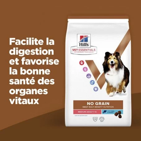 Bu00e9nu00e9fices des croquettes Vet Essentials Chien Multi-Benefit Adult + Medium Non Grain Thon